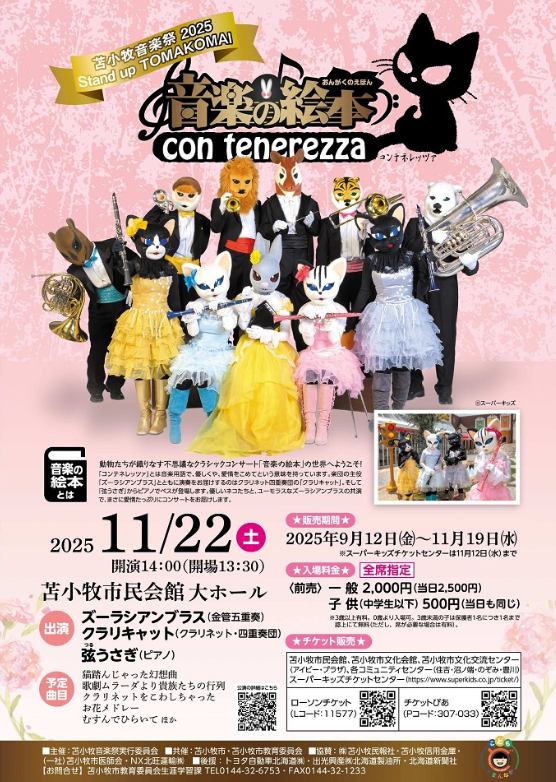子供から大人まで楽しめるコンサート、「音楽の絵本」が今年も苫小牧にやってきます。今回はズーラシアンブラスに加えて、クラリネット四重奏団の「クラリキャット」と「弦うさぎ」からピアノのベスが登場します。動物たちの愛情たっぷりの楽しいコンサートをぜひごらんください。多くのご来場をお待ちしております。