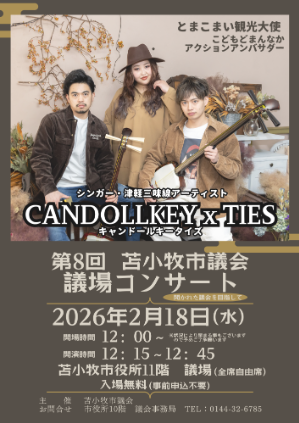 令和8年2月18日に第8回議場コンサートを開催します。今回は、とまこまい観光大使であり、こどもどまんなかアクションアンバサダーであるCANDOLLKEY×TIES(キャンドールキータイズ)さんにご出演いただき、幼稚園児たちと一緒にこどもどまんなかアクション公式ソングなどを披露する予定です。
